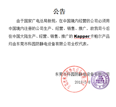 由于國家廣電總局新規:在中國境內經營的公司必須用中國境內注冊的公司生產、經營、銷售、推廣,故我司今后在中國大陸生產、經營、銷售、推廣的Kapper卡帕爾產品均由東莞市科園防靜電設備有限公司全權代表