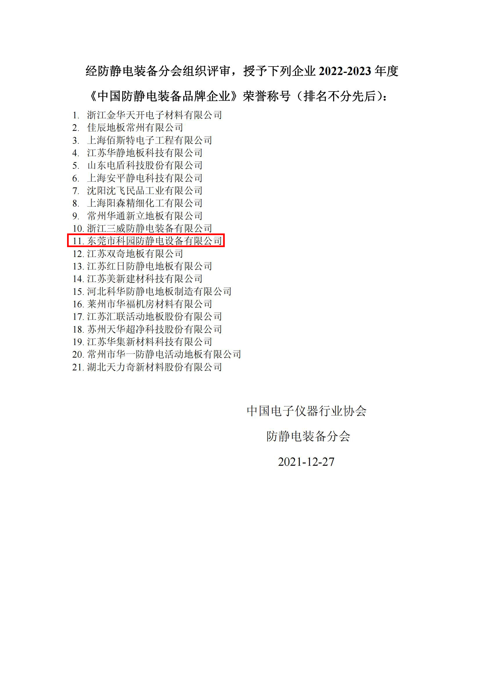 科園防靜電獲得2022-2023 年度 《中國防靜電裝備品牌企業》榮譽稱號