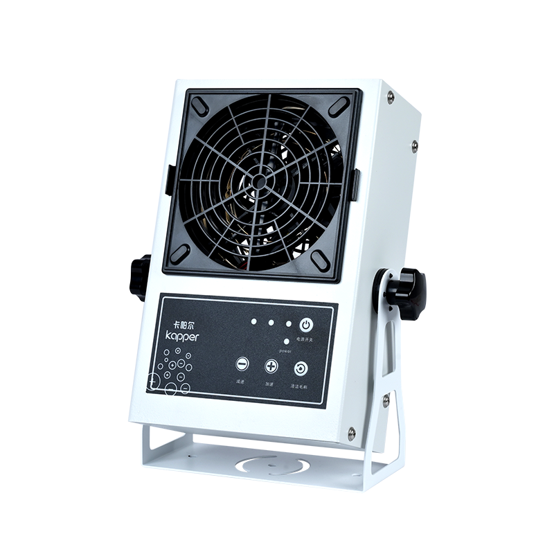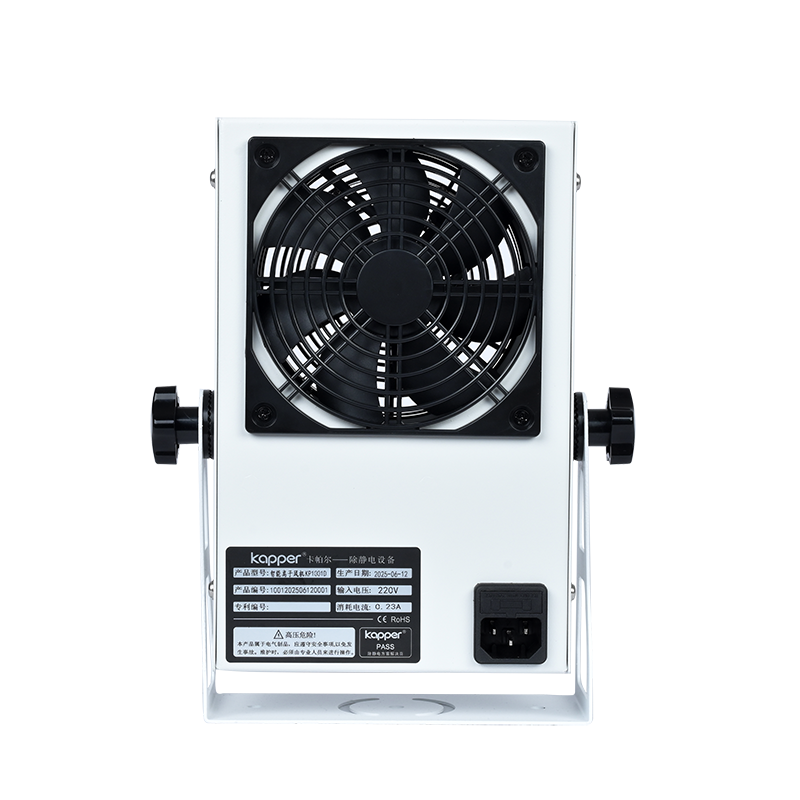 KP1001D半智能型臺式離子風機可產生大量的帶有正負電荷的氣流,可以將物體上所帶的電荷中和掉。當物體表面所帶為負電荷,它會吸引氣流中的正電荷,當物體表面所帶為正電荷時,它會吸引氣流中的負電荷,從而使物體表面上的靜電被中和,達到消除靜電的目的。